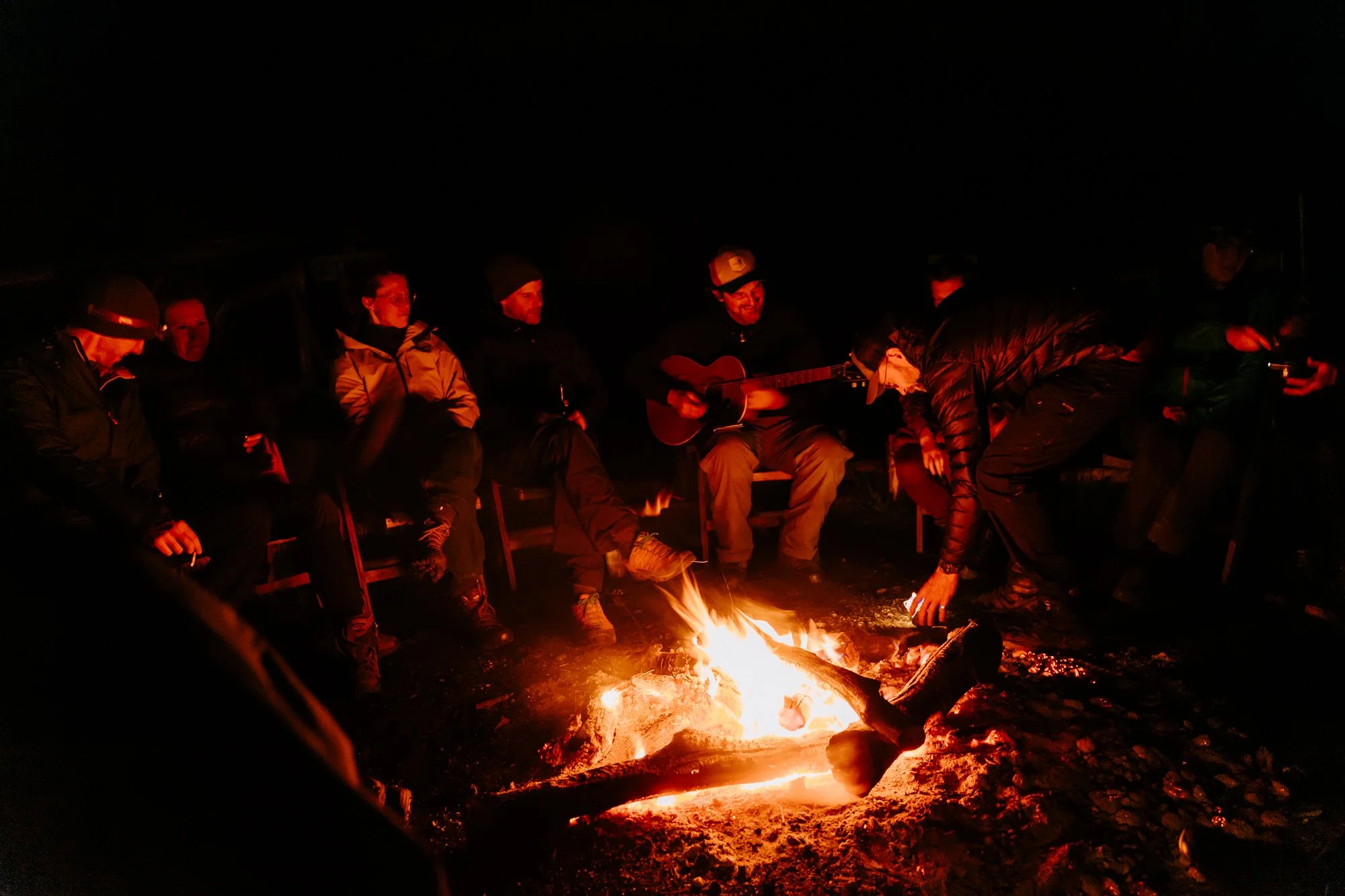 Lieven is al een tijdje verdwenen, is hij nog bezig in de keuken? Aan de telefoon met het thuisfront? Nee hoor, hij was even zijn gitaar aan het stemmen want vanavond geeft hij een solo-concert van enkele liedjes van zijn band Fence. We kruipen allemaal nog wat dichter op onze houten klapstoeltjes en luisteren naar Lieven en zijn gitaar. Het is iets speciaal, naar een stripped down versie van rockliedjes luisteren in ‘the middle of nowhere’. Kampvuurvibes op z’n best. Na het concert krijgen we nog een heerlijke appel-crumble geserveerd, gebakken in een ‘dutch oven’ op het vuur. Daarna is het tijd om in ons nest te kruipen want morgen staat weer een dagje wandelen voor de boeg.